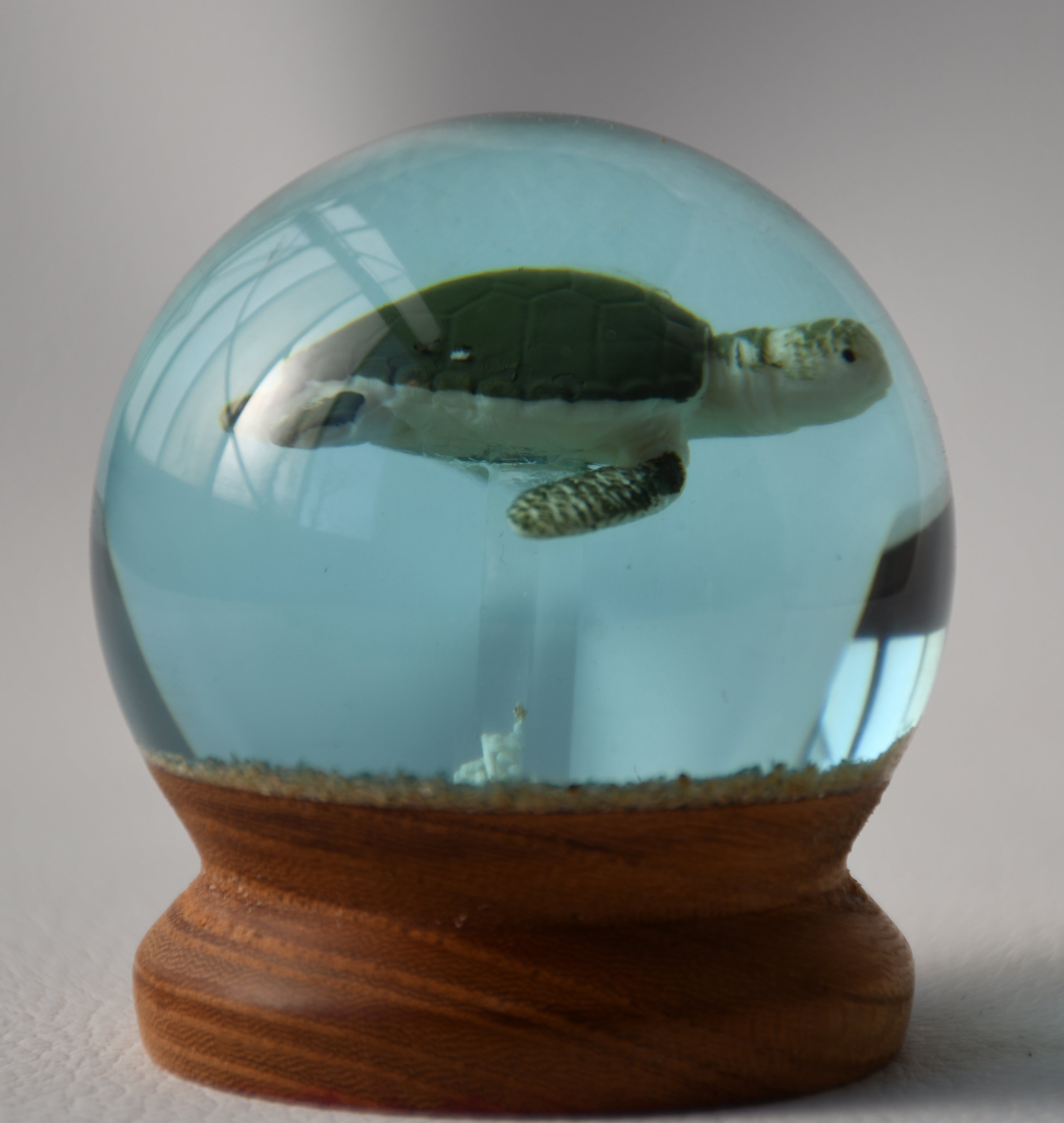 見る者を優しい気持ちにしてくれる、癒しの存在です。この海亀は、ウッドレジンで作られ、磨き上げられているため、光沢があり、曇りがありません。